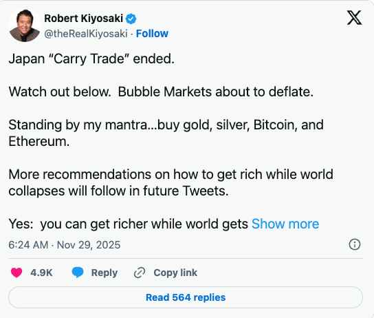Macro nerves remain elevated, especially after Robert Kiyosaki warned that the yen carry trade unwind could spark a global liquidity shock. But others argue that the yen unwind could benefit BTC in the medium term by accelerating risk-asset rotation and boosting demand for decentralized hedges.