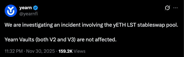 The sell-off intensified shortly after Yearn Finance posted an alert on X, reporting an “incident” in its yETH liquidity pool. The team emphasized that its V2 and V3 vaults were untouched, but the damage inside the pool was already spreading through the market.