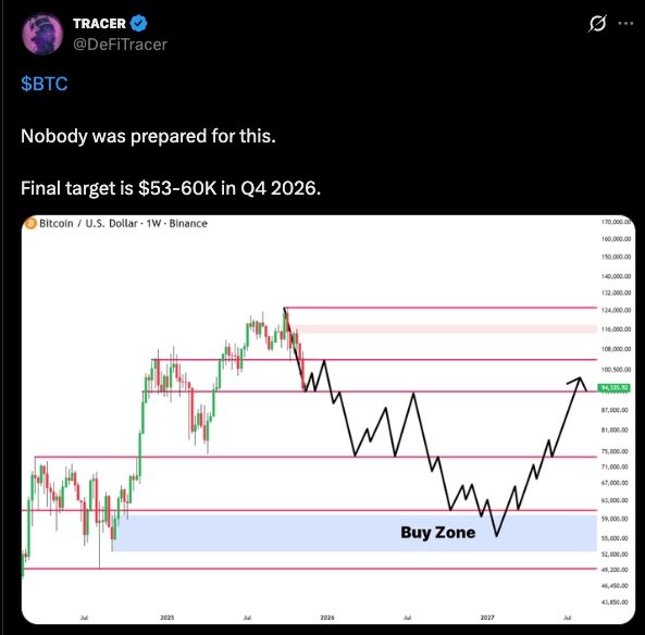 According to on-chain analyst DeFiTracer, historical rhythms still point to the true cycle bottom arriving only in Q4 2026, not now. In previous cycles, price corrected hard before one final parabolic push — the famous “last furnace burn” before the multi-year winter.