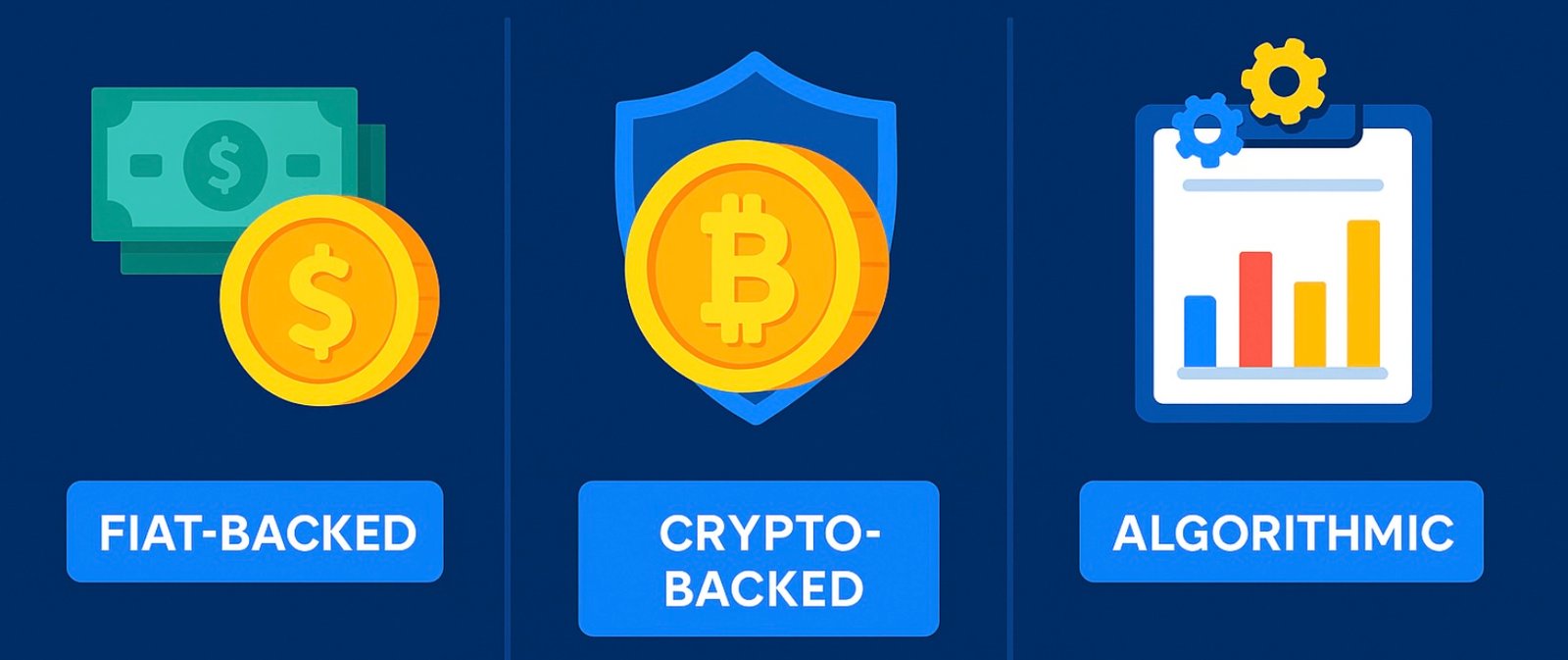 - ₿₿ Crypto-backed: Collateralized by other cryptocurrencies locked in smart contracts (e.g., DAI).