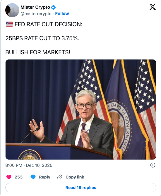 The move comes just hours after the Federal Reserve delivered another 25 bps rate cut — a widely expected decision, but not enough to ignite fresh demand or push BTC toward the long-teased $100K breakout.