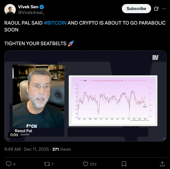 Adding fuel to the debate, a widely shared clip circulating on X claims Raoul Pal believes Bitcoin and crypto are “about to go parabolic soon,” citing liquidity models that suggest the next leg could be sharp once financial conditions loosen. Whether that optimism lands depends on one thing the market still doesn’t have: buyers willing to step in now.