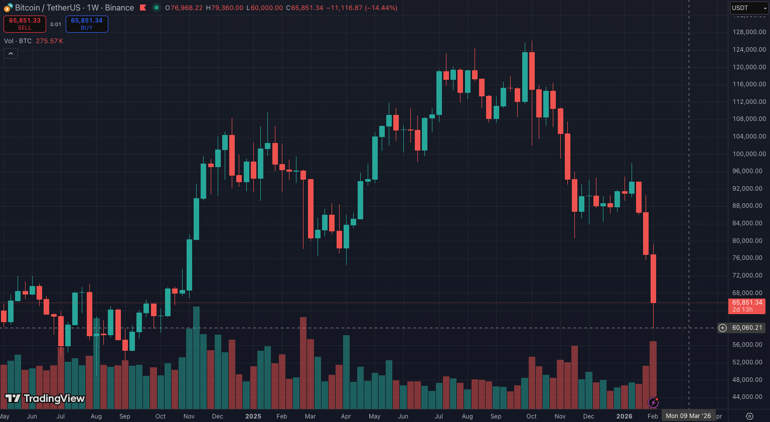 The bounce back above $65K doesn’t really change that. It helps sentiment, sure. But rebounds after forced selling are common. The real question is whether the seller is done — or just paused. Mr. PermaBear doesn’t seem to think so…
